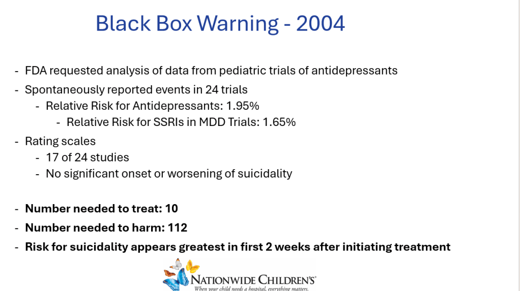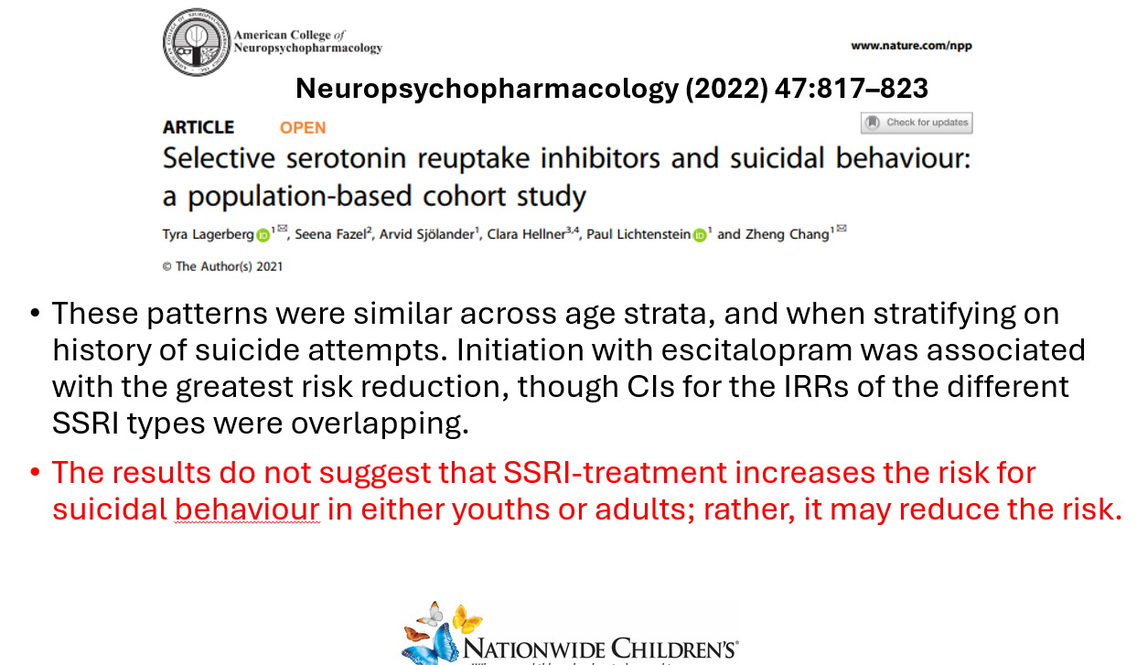 • Safety: Despite black box warning, recent studies have suggested SSRIs may lower the risk of suicidality overall