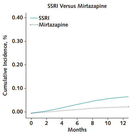 - There was a slight increase risk of microscopic colitis in patients receiving SSRIs compared to mirtazapine. The estimated 12-month risk difference was 0.04% (95% CI, 0.03% to 0.05%) for selective serotonin receptor inhibitors (SSRIs) versus mirtazapine.