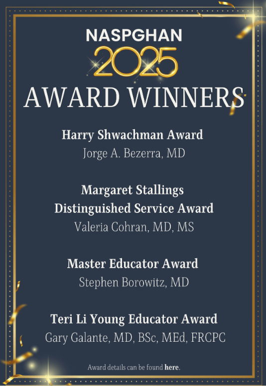 NASPGHAN Awards 2025 Posted on August 5, 2025 by gutsandgrowth Congratulations to this year’s award winners! Share this: Click to email a link to a friend (Opens in new window) Email Click to share on X (Opens in new window) X Click to share on Facebook (Opens in new window) Facebook Like Loading... Related
