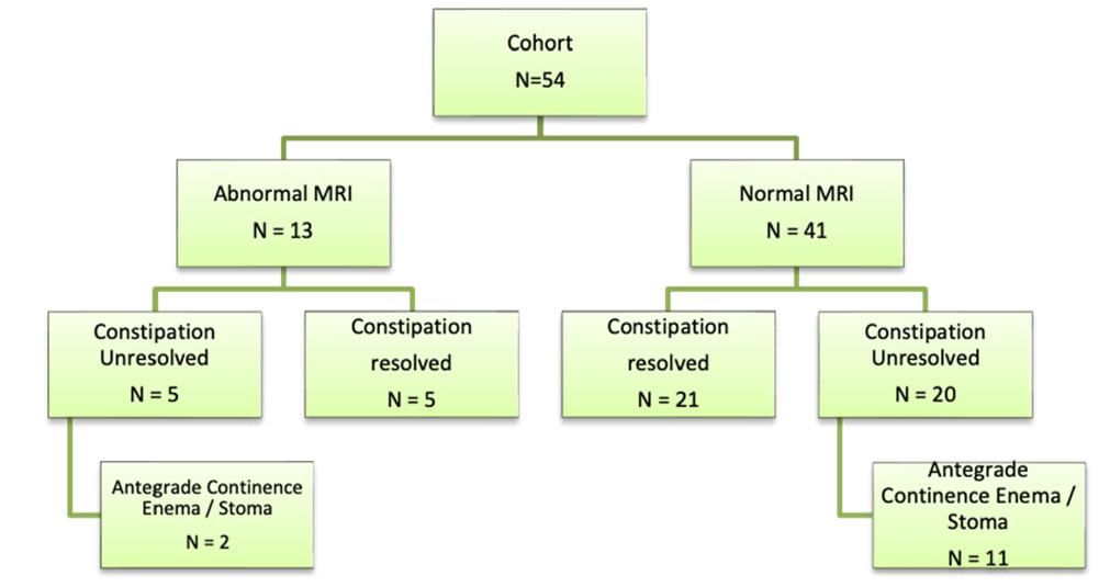 - There was no difference in the number of patients or time to constipation resolution between those with and without abnormal MRI respectively