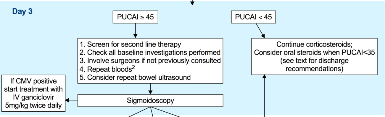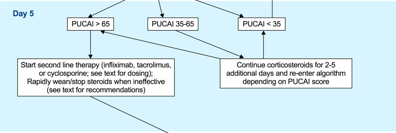 - Second-line therapy should be initiated on the 5th day of IVCS treatment in children with a PUCAI ≥ 65 [EL2, adults EL2] (*100% agreement).