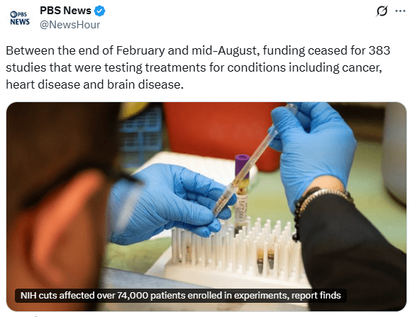 PBS News 11/17/25: NIH cuts affected over 74,000 patients enrolled in experiments, report finds