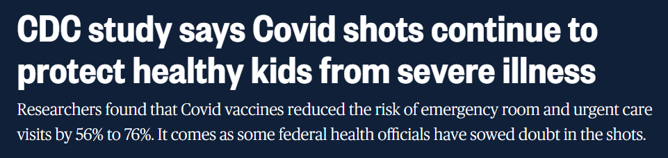 CDC Study: “From late August 2024 to early September 2025, the vaccines reduced the risk of Covid-related emergency room and urgent care visits by 76% among children ages 9 months to 4 years, and by 56% among children ages 5-17, according to the study”