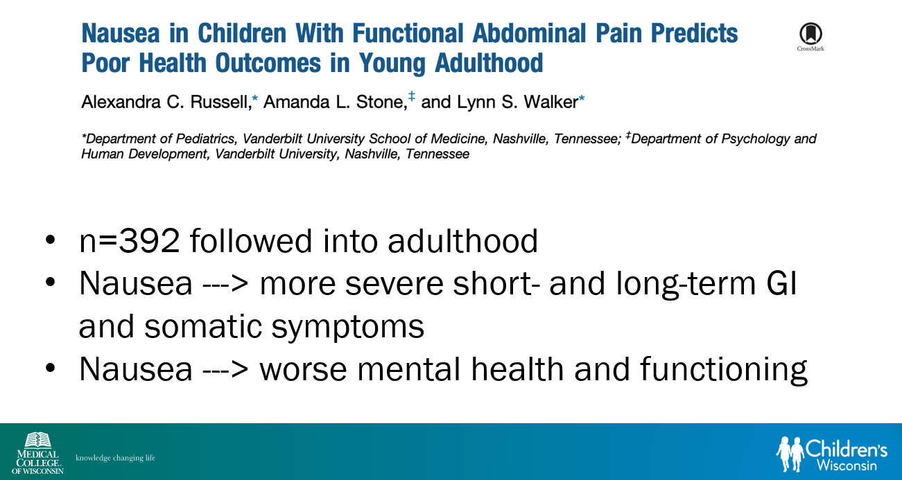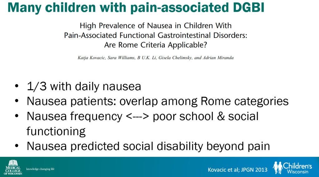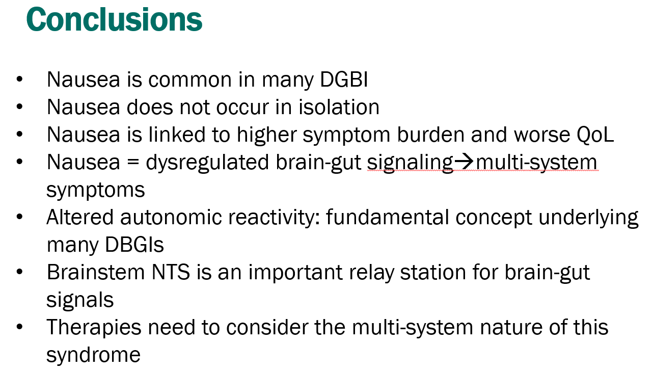 • Recent research suggests that functional nausea overlaps with other DGBIs including functional dyspepsia, IBS and even gastroparesis