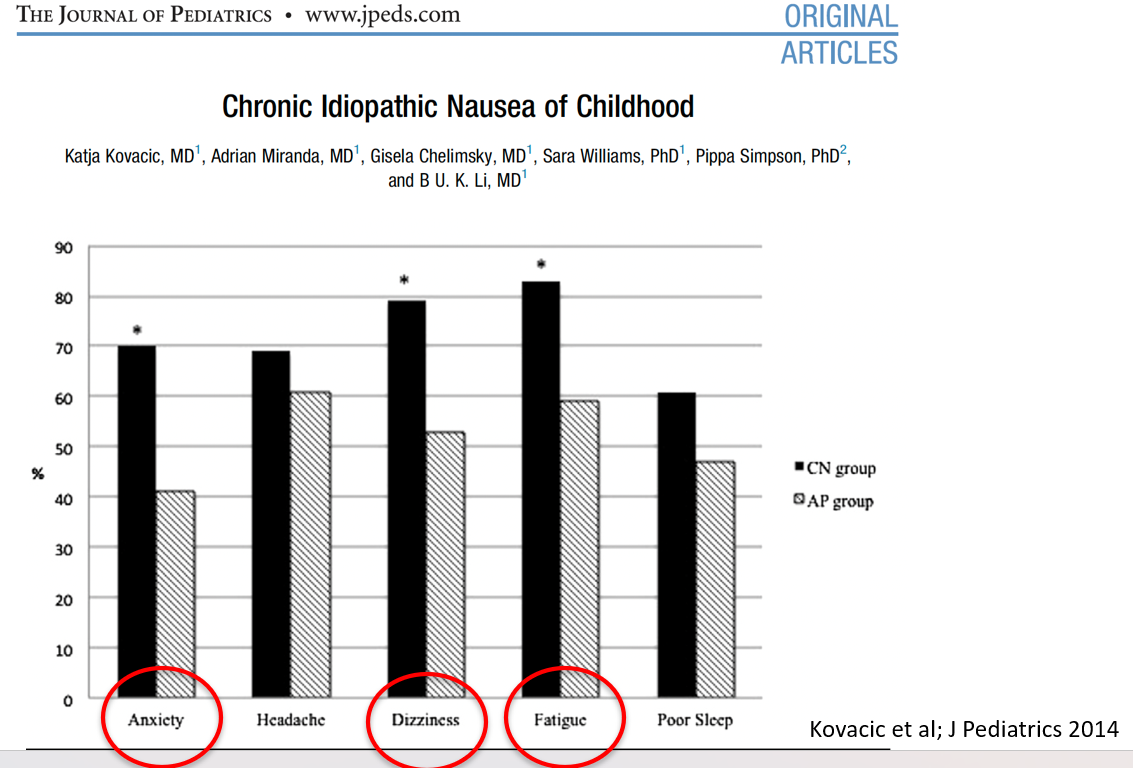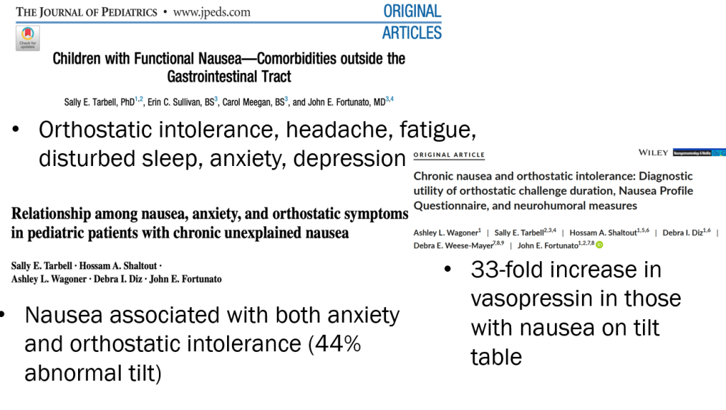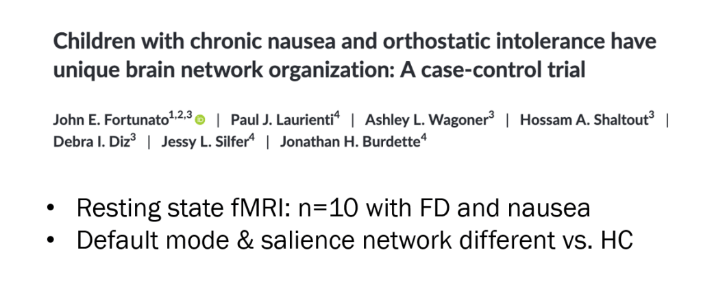 • A small (n=10) functional MRI study showed abnormal brain network organization in patients with nausea and orthostatic intolerance