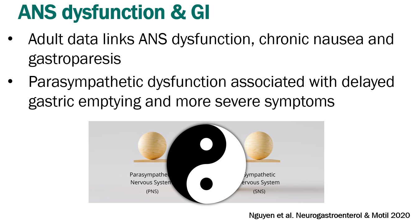 • Cyclic vomiting is associated with autonomic nervous system alterations. In adolescence, the disorder often changes to chronic symptoms