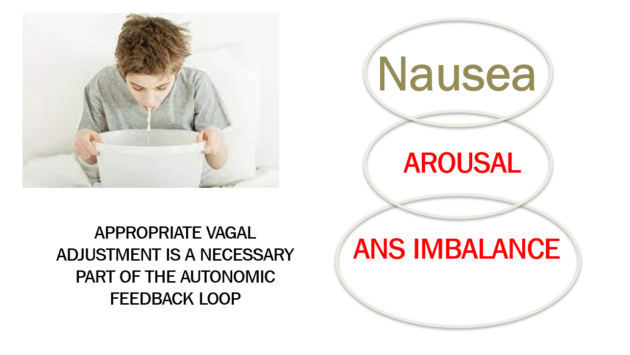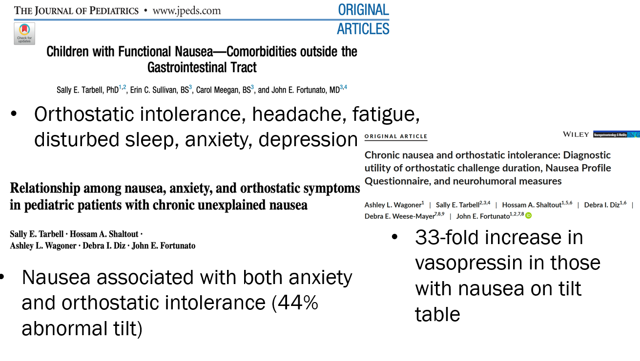 • Morning nausea, associated with being upright, is characteristic of dysautonomia. Other symptoms include ; palpitations, anxiety, sweating
