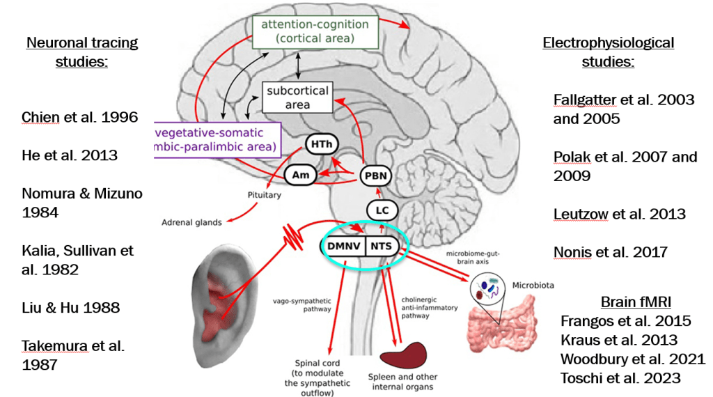 The auricular branch of the vagus projects to brainstem NTS. 95% of vagal afferent projections end up in NTS which in turn is directly and indirectly connected to a network of higher brain regions of the central