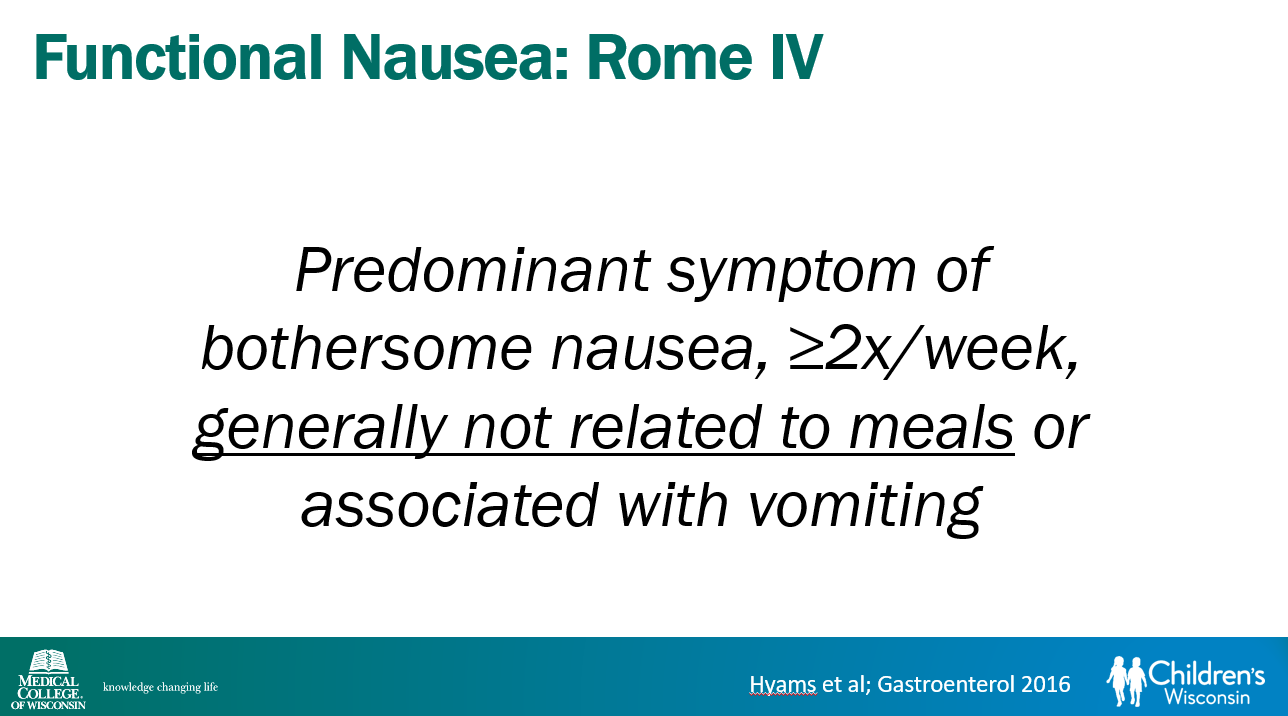 • Delayed gastric emptying is found in a subset of patients who meet criteria for functional nausea (though there are limitations of GE studies)