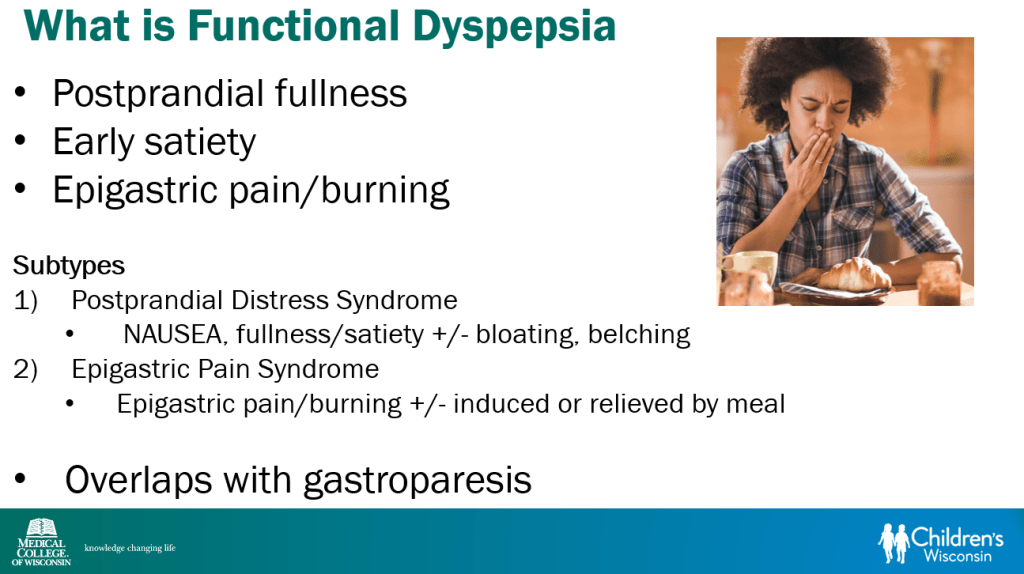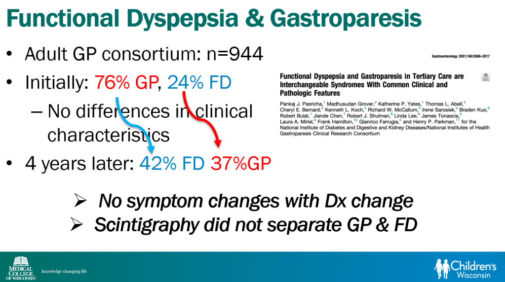 • Functional dyspepsia and gastroparesis overlap and may be part of same disorder