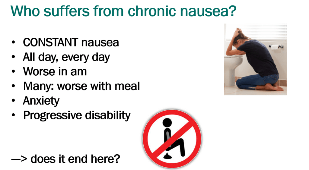 Recently, Dr. Katja Karrento gave our group a great update on chronic nausea.  My notes below may contain errors in transcription and in omission. Along with my notes, I have included many of her slides.