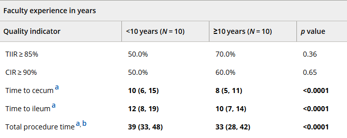 - Faculty years’ experience (≥10 vs. <10 years) predicted shorter procedure duration (adjusted hazard ratio [confidence interval]: 1.40)