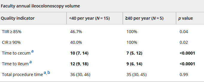 My take (borrowed in part from the authors): The authors state that “our findings suggest that a threshold of 40 annual procedures [ileocolonoscopies] is necessary to maintain high pediatric endoscopic quality.” While I agree that adequate procedural volume is helpful, there is a great deal of individual variation/ability. Particularly if the endoscopist has a lower procedural volume, metrics like ileal intubation rate can be useful to assure good quality.
