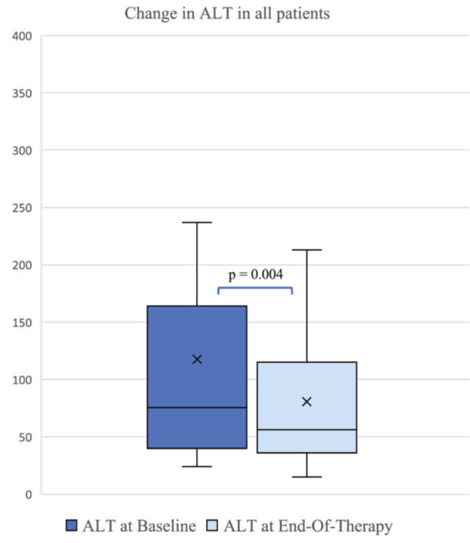 • ALT improved by a mean of 56 U/L at 6 months (p = 0.04), and by 37 U/L at en-of-treatment (p = 0.004).