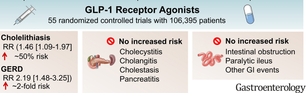 With the widespread adoption of GLP-1 RAs, there have been increasing reports of adverse effects. This systematic review/meta-analysis (with 55 randomized controlled trials involving 106,395 participants) more fully describes the likelihood of GI adverse events.