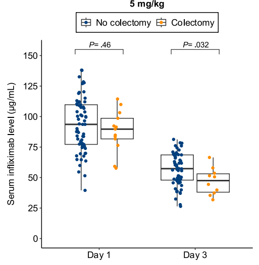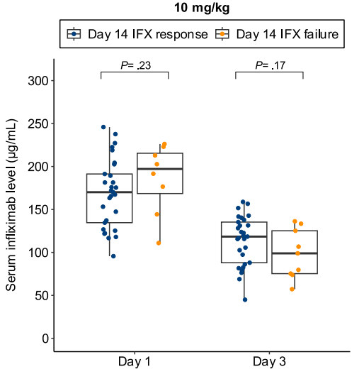 - In patients with high clearance who did not respond to the first infliximab dose, day 14 response rate was higher with a second 10 mg/kg vs 5 mg/kg dose (38% vs 11%; risk ratio, 3.43)