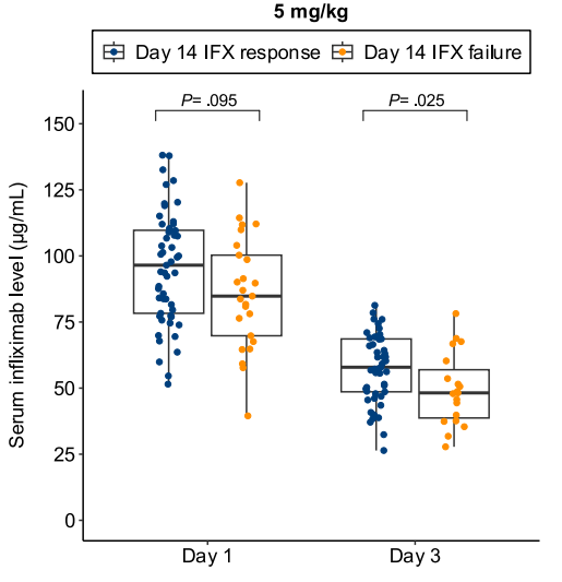 - Day 3 fecal infliximab levels correlated with endoscopic severity and was associated with day 7 nonresponse (P = .016)