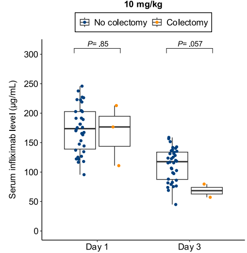 - Lower day 3 serum infliximab levels predicted infliximab failure on day 14 and colectomy by 3 months; a threshold of ≤57.9 μg/mL had 83% sensitivity, 67% specificity, 24% positive predictive value, and 97% negative predictive value for colectomy