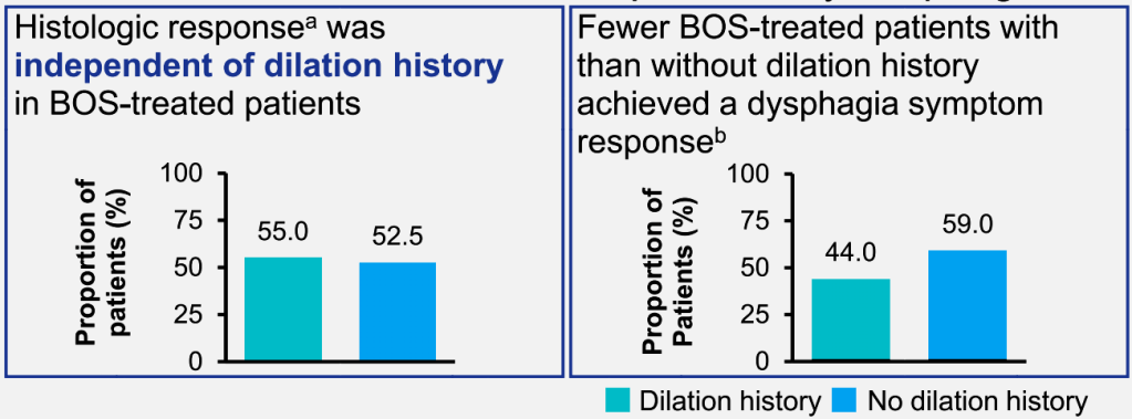 - Fewer BOS-treated patients with dilation history than no dilation history achieved a dysphagia symptom response (44.0% vs 59.0%)