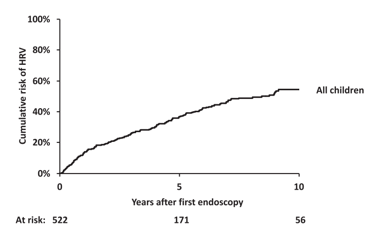 - 5- and 10-year probabilities of HRV emergence in initially HRV-negative children were 36% and 54%, respectively