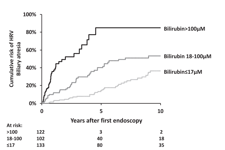 - “It is notable that children with Alagille syndrome and those with genetic cholestasis with normal GGT have a lower rate of variceal progression and a lower mean HRV score than children with biliary atresia, despite comparably high levels of bilirubin. This suggests that different mechanisms of cholestasis … may have distinct consequences on intrahepatic portal vein branches resulting in varying degrees of portal hypertension.”