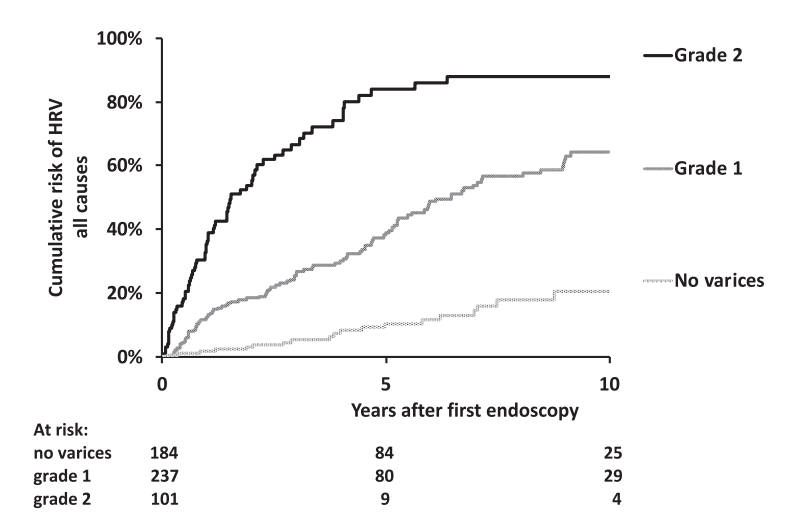 - “Gastrointestinal bleeding was recorded in 36 of 947 children (3.8%) who did not have HRV at their last endoscopy and in 270 of the 359 children (75%) with HRV at their last endoscopy who did not undergo endoscopic or surgical primary prophylaxis of bleeding.”