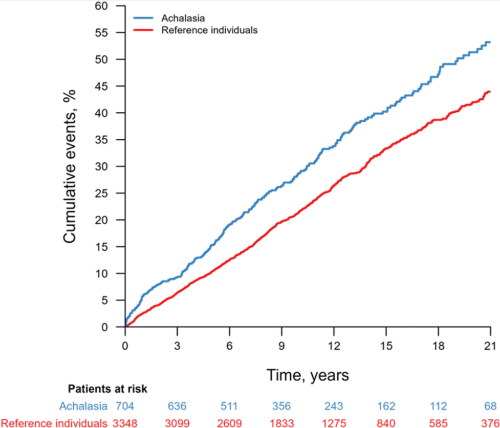Methods: This study was a nationwide, population-based, matched cohort study using the Epidemiology Strengthened by Histopathology Reports in Sweden (ESPRESSO) cohort which included all adults in Sweden with incident achalasia (n = 704; 1969–2017; follow-up until December 31, 2021) without any other prior esophageal conditions. Individuals with achalasia were matched by age, sex, birth year, and county to up to 5 reference individuals (n = 3348) from the general population. The median follow-up was 9.1 years. Medians age in the study was 60 years.