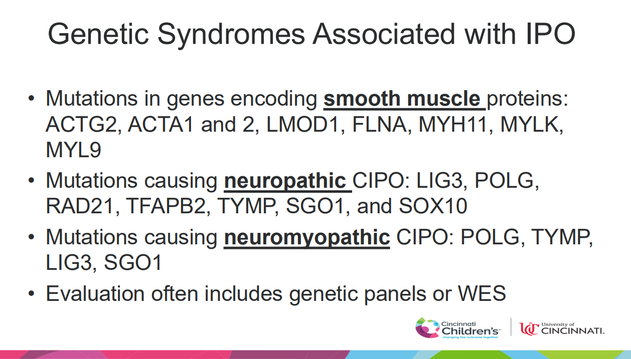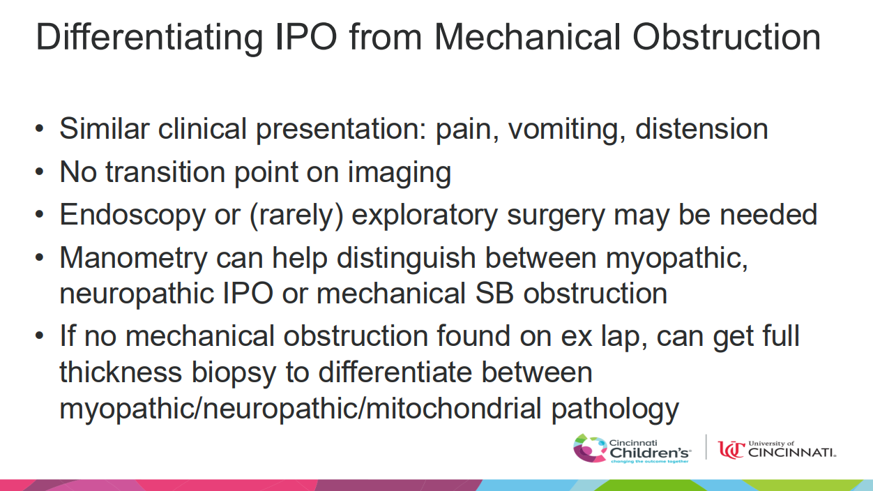 - Several subtypes of intestinal pseudo-obstruction: myopathy, mesenchymopathy, neuropathy