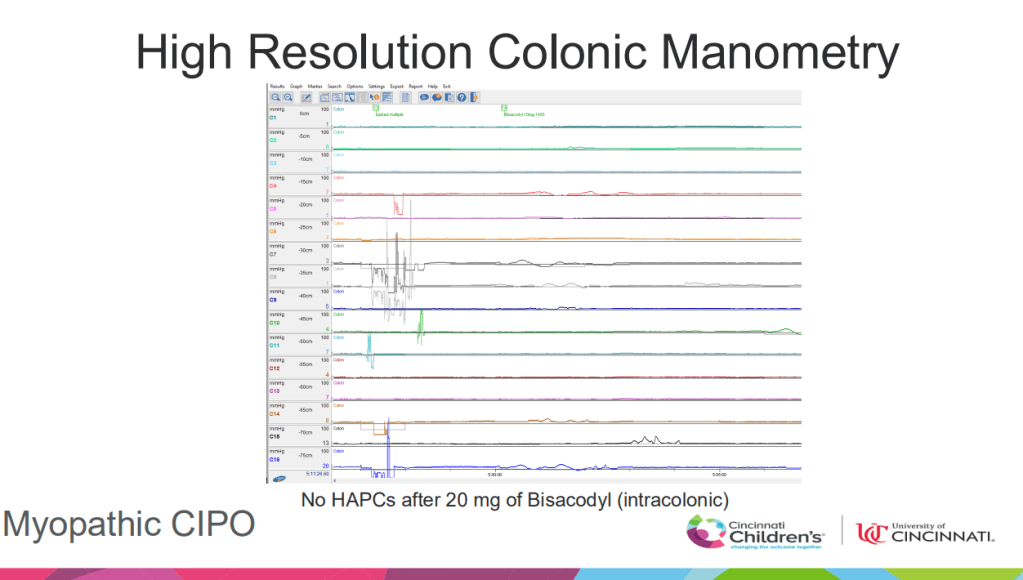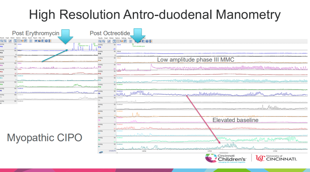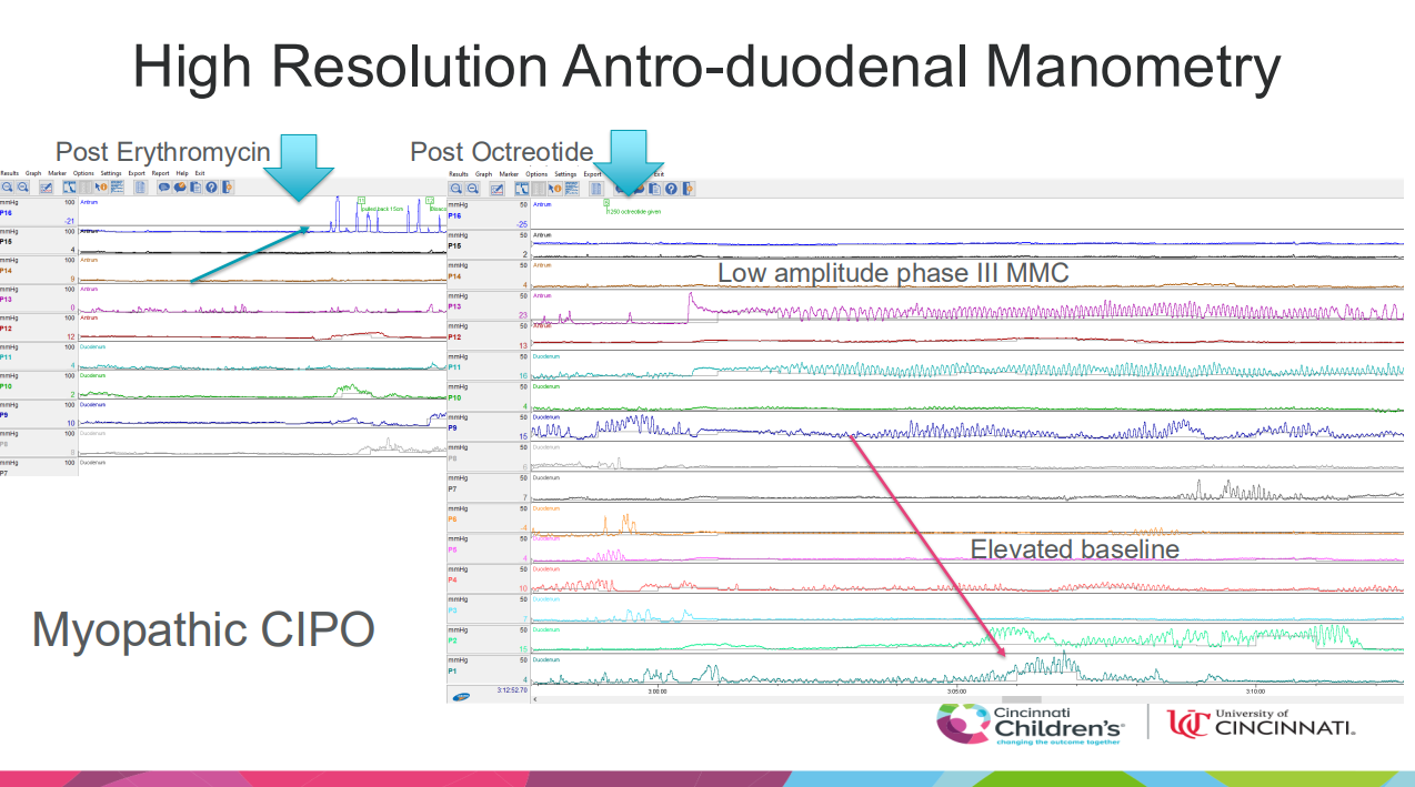 - Myopathic CIPO is characterized by low amplitude phase III MMC on manometry