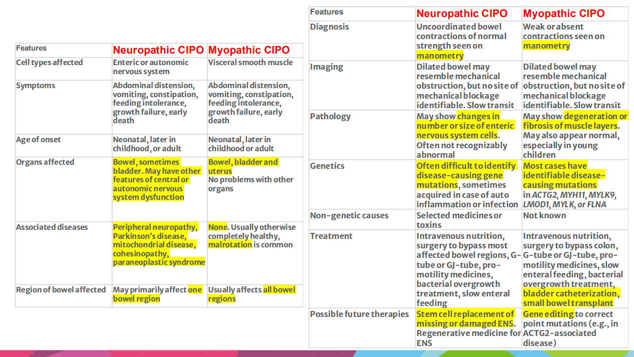 - Myopathic CIPO affects all bowel regions along with bladder/uterus. Myopathic CIPO patients are often good candidates for intestinal transplantation. Neuropathic CIPO can be isolated to one region of the bowel