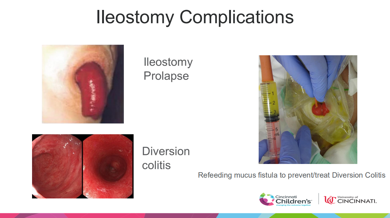 - Ileostomy prolapse and diversion colitis are frequent complications. Diversion colitis can be managed with refeeding into mucus fistula