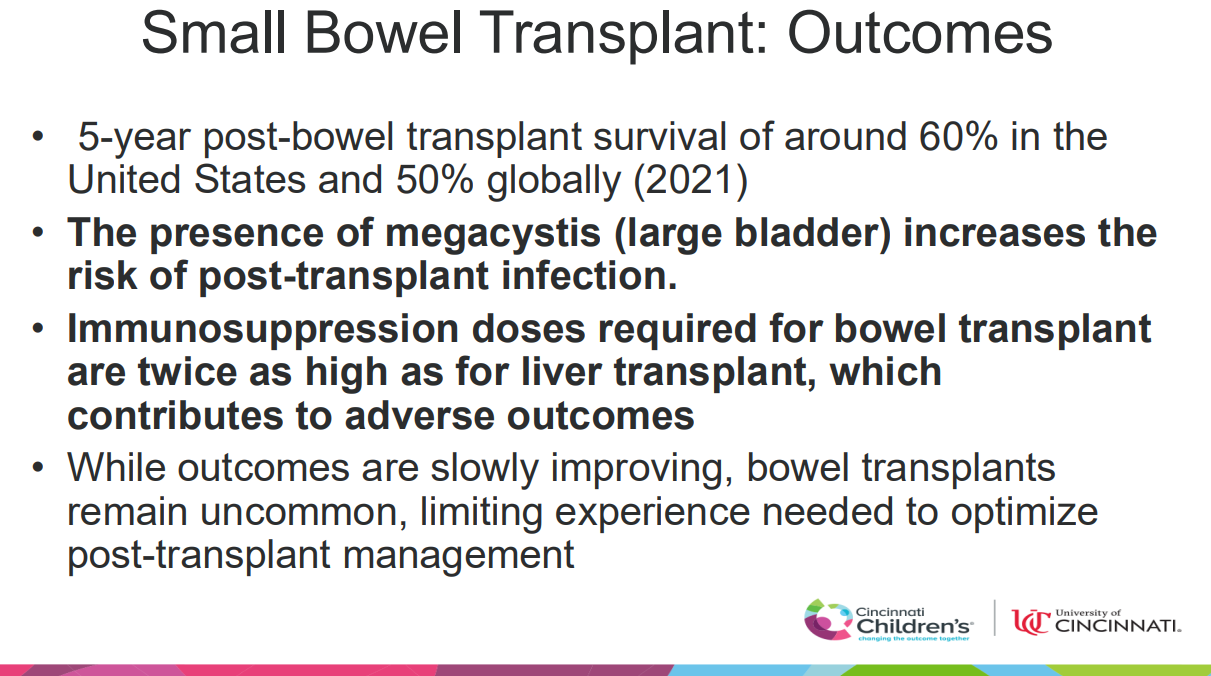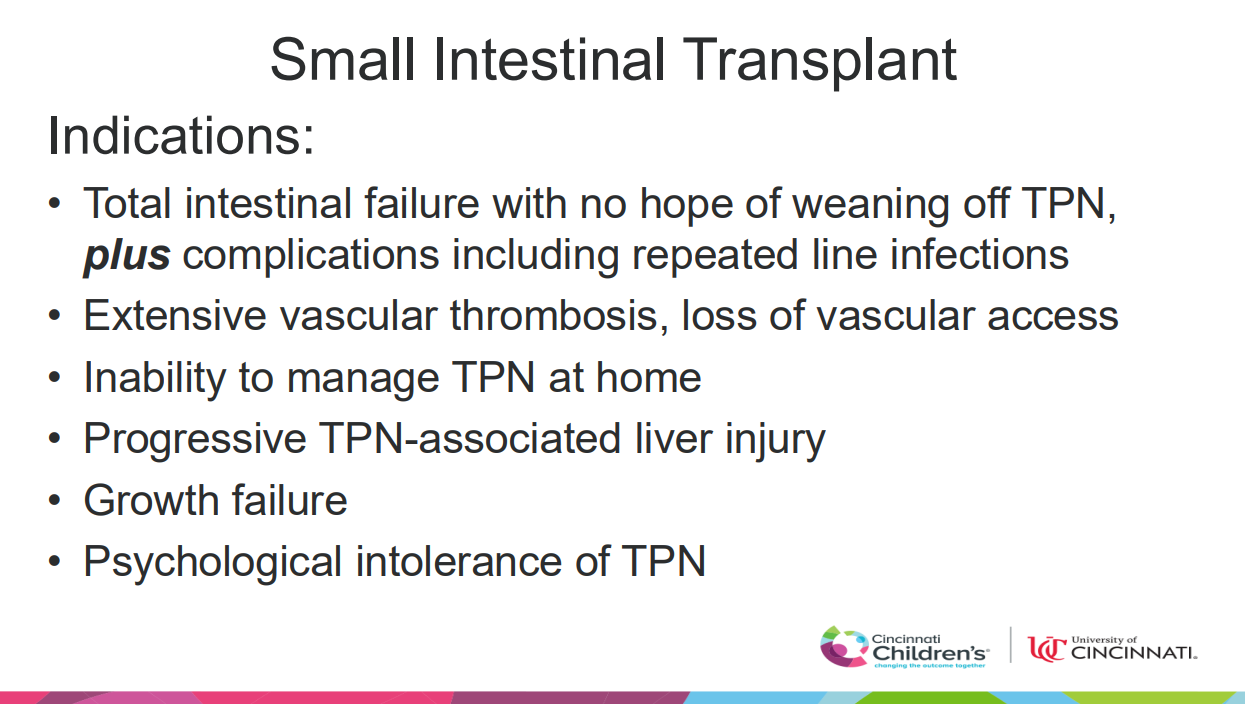- Intestinal transplantation is being used much less often due to better management of intestinal failure. CCHMC only had one child undergo ITx last year. ITx in U.S. now has an estimated 5-year survival of 60%
