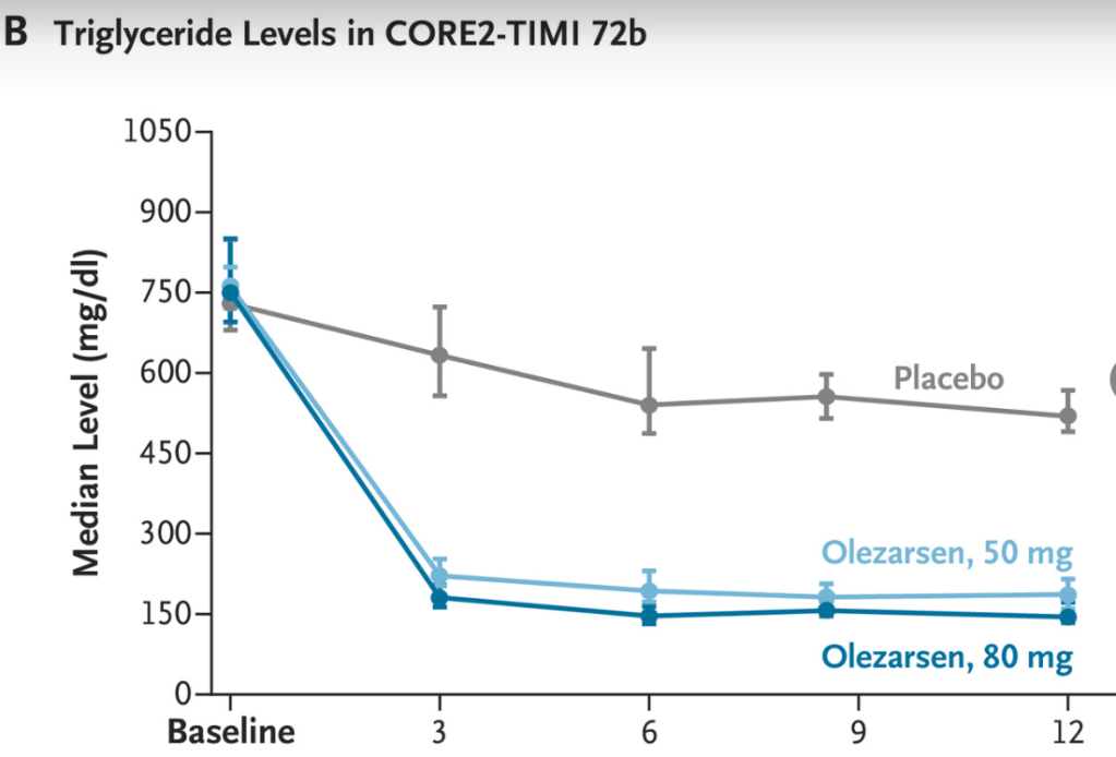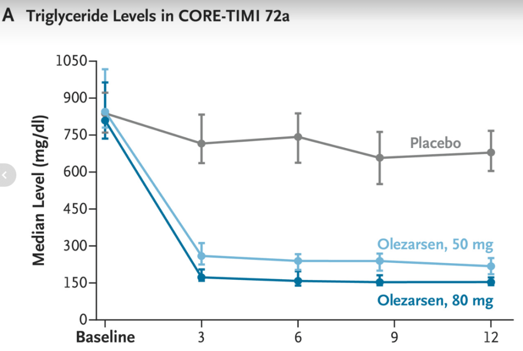 Background: “Severe hypertriglyceridemia, defined as a serum triglyceride level of 500 mg per deciliter or higher (≥5.65 mmol per liter), affects approximately 1 in 100 persons and can have clinical consequences, including an increased risk of life-threatening acute pancreatitis. Conventional triglyceride-lowering therapies, such as fibrates and n–3 fatty acids, often have modest effects on the triglyceride level and have not been shown to reduce the risk of acute pancreatitis.3“