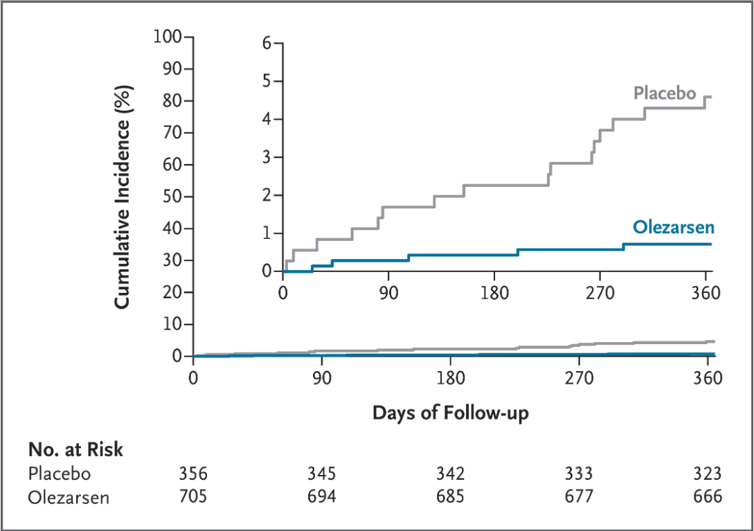 - During the 1-year trial, major adverse cardiovascular events occurred in 2.0% of the pooled olezarsen group and 2.5% of patients receiving placebo.