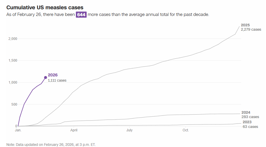 The US is on track for another record-breaking year for measles: The number of measles cases reported in the first eight weeks of the year — 1,136 as of February 26, according to CDC data — is already six times more than typical for an entire year. A tracker from the Johns Hopkins University Center for Outbreak Response Innovation has tallied an even higher the annual case total than the CDC…