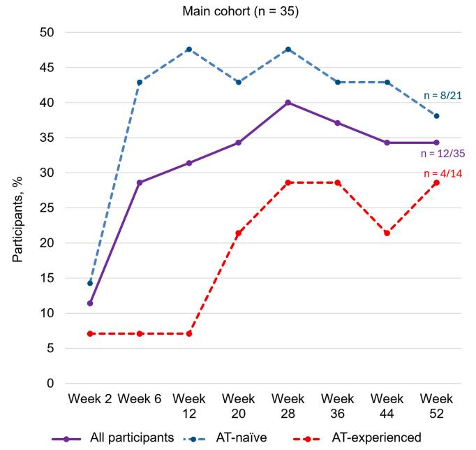 Methods: This open-label, phase 2a, single-arm, multicenter trial (EMERALD-1) comprised a 6-week screening period, a 52-week active treatment period (including a 12-week induction period and 40-week maintenance period), and a 4-week safety follow-up period. Of the 35 participants enrolled in the main cohort, 18 participants received 100 mg of oral MORF-057 twice daily for the entire treatment period.