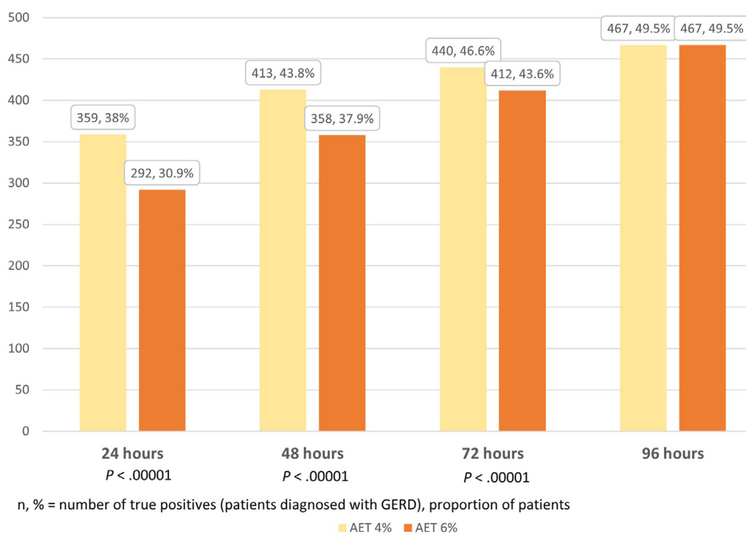• With longer duration, more patients were able to be diagnosed with GERD and fewer patients were in the indeterminate group. The proportion of patients with inconclusive results (AET 4%–6%) reduced from 113 of 944 at 24 hours to 40 of 113 at 96 hours (35% of subgroup; P = .02)