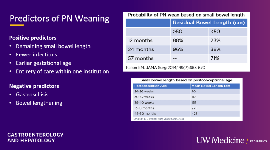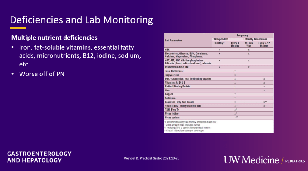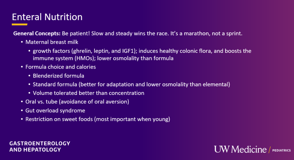 My notes below may contain errors in transcription and in omission. In addition, the information provided is based on what is done in Seattle. However, there is not a lot of evidence for much of what is done in intestinal rehabilitation. Thus, there is variation in practice at different centers and what works for one patient might not work for another. Following my notes, I have included many of her slides.