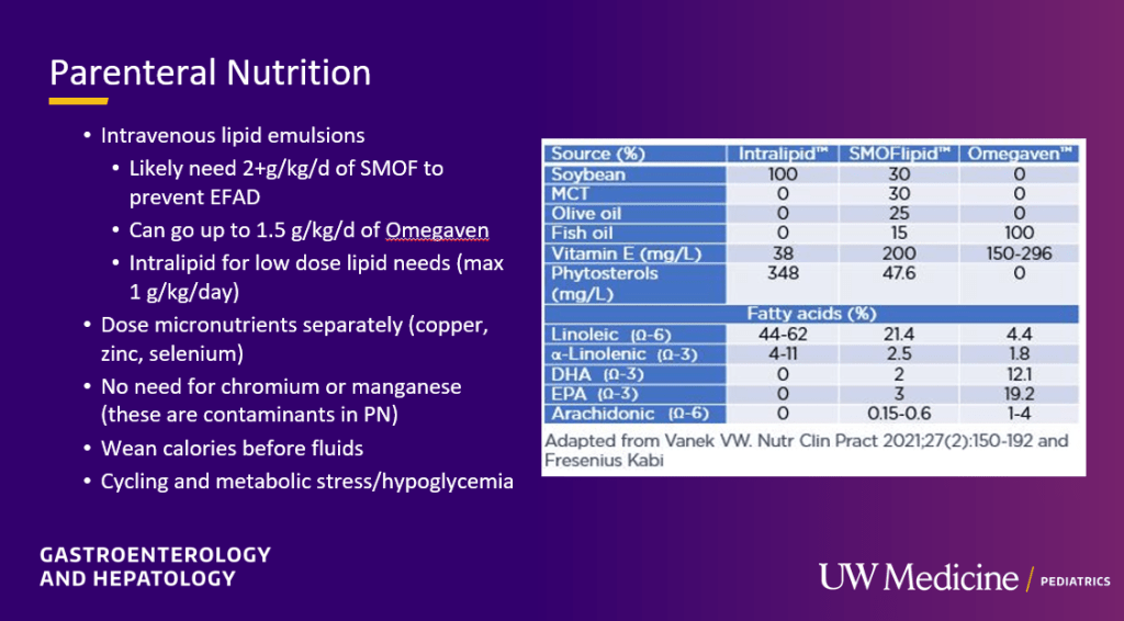 - Lipid emulsions: SMOFlipid at 2 gm/day can help prevent essential fatty acid deficiency (EFA). Omegaven may need to be dosed at 1.5 gm/day to prevent EFA. If used for short-term and low dose, standard intralipid can be useful