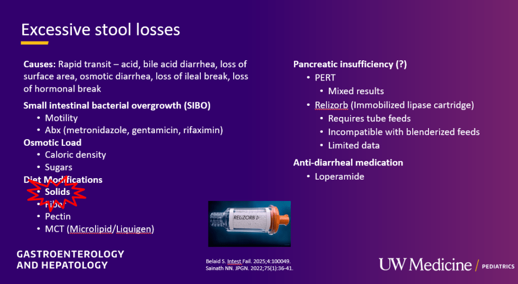 - Pancreatic enzymes: It is unclear if pancreatic enzymes (PERT, Relizorb) will improve stool output due to lack of data