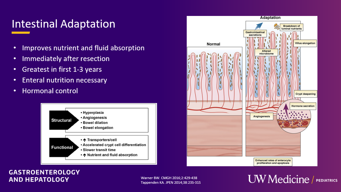 - Enteral feedings promote intestinal adaptation. Pediatric patients with SBS require much higher calories with enteral nutrition and may have hyperphagia as a compensatory mechanism