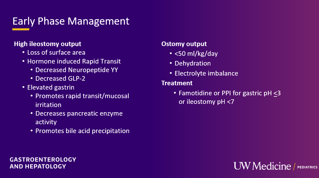 - Output goals: Most pediatric patients can tolerate output of 50 mL/kg/day of ostomy output (if being supported by PN), though less than 30 mL/kg/day is more physiologic
