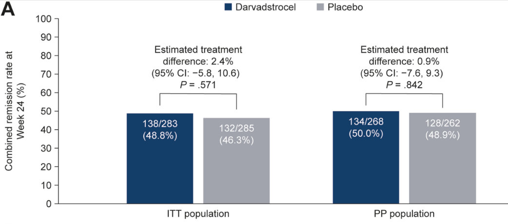 - At week 24, combined remission was achieved in 138 of 283 (48.8%) patients in the darvadstrocel group and 132 of 285 (46.3%) in the placebo group