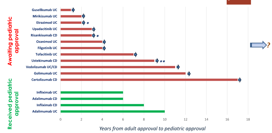 “It has been 11 years since the adult approval of vedolizumab and 9 years since the approval of ustekinumab, yet neither is currently approved for use in children (Table 1). Instead of taking the necessary steps to shorten this unacceptable delay, there are now extra hurdles for clinical trials such as three ileocolonoscopies over 1 year in both pediatric CD and UC, as suggested by the FDA…”