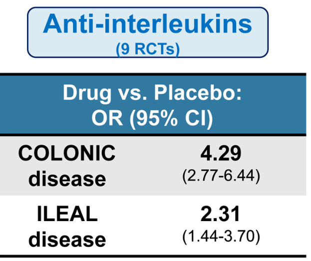 • Anti-interleukins (eg. IL23 o rIL12/IL23 agents) worked best for ileal disease among these advanced therapies