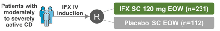 In the study by Sands et al, this post-hoc analysis included week (W) 10 responders (n=329) to intravenous IFX induction therapy who were randomized to receive IFX SC 120 mg every 2 weeks or placebo (PBO) during maintenance therapy.