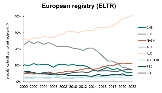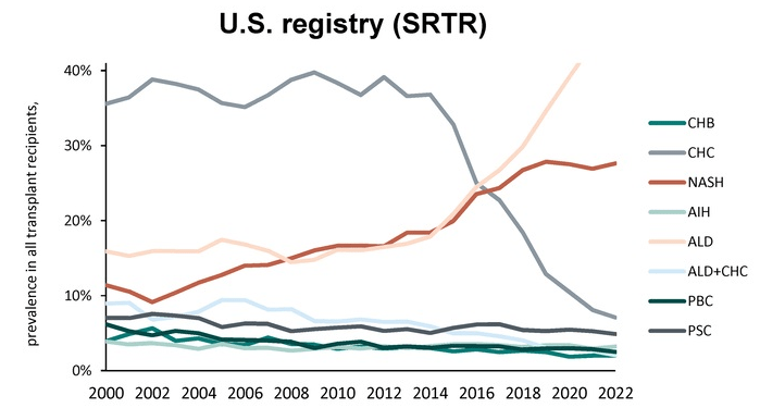 - #1 cause in 2022: Alcohol-associated liver disease (ALD) increased: SRTR 15%to 45%, and ELTR 25% to 41%