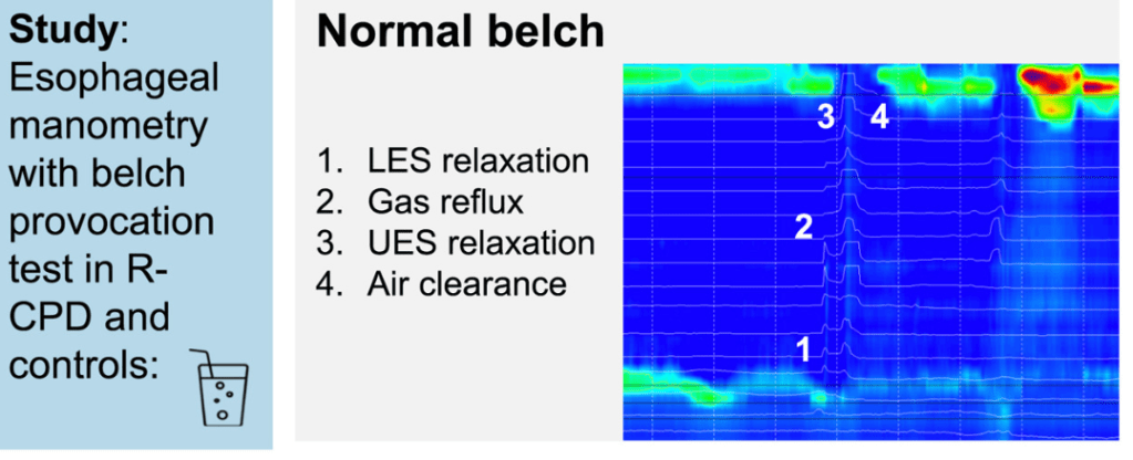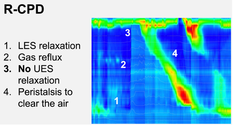 Methods: Retrospective analysis of High Resolution Impedance Manometry (HRiM) with belch provocation was performed between May 2021 and April 2024 in 55 patients with R-CPD, 30 control patients, and 15 healthy volunteers. Age of patients with R-CPD was 22-35 years.