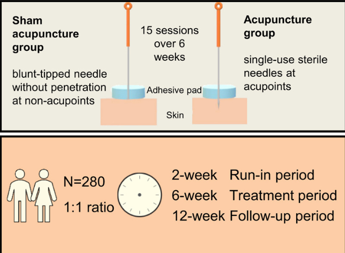 This ACTION study enrolled 280 patients (18-75 yrs) with IBS-D in a multicenter randomized controlled trial in 6 hospitals in China. “For the sham acupuncture group, blunt-tipped placebo needles with a similar appearance to real needles were used over the adhesive pads with no skin penetration. Five fixed pairs of non-acupoints (10 stimulation points in total) away from meridians or conventional acupoints were used.”