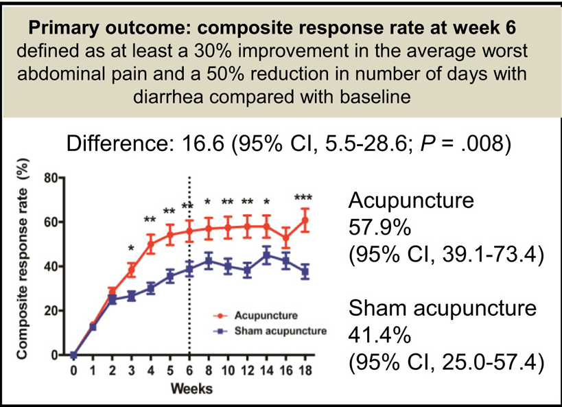 Acupuncture for irritable bowel syndrome (2012). In this study, true acupuncture was not shown to be more effective than sham acupuncture; however, there was a high placebo response with sham acupuncture